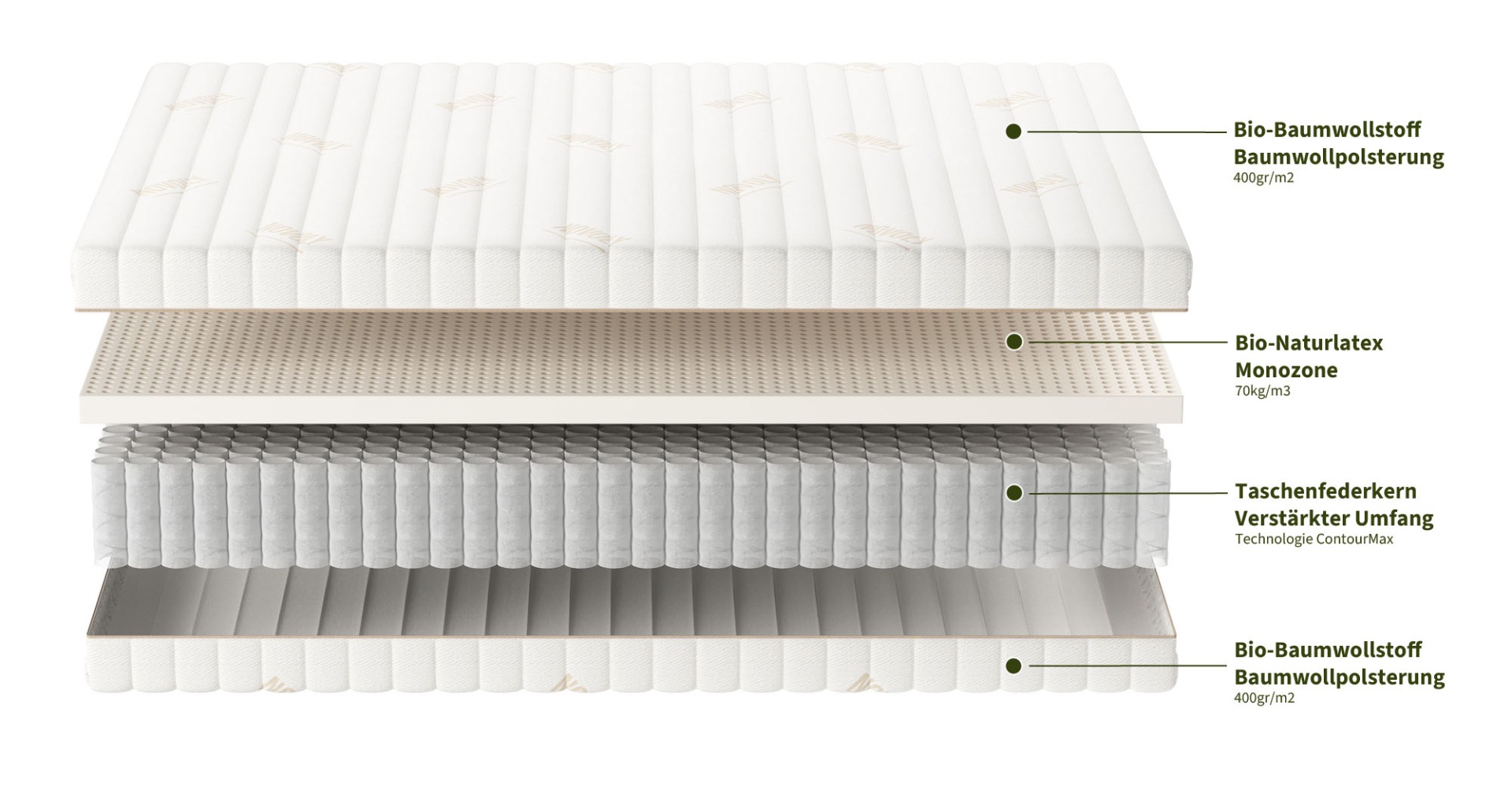 Eine Matratze aus GOLS-zertifiziertem Bio-Naturlatex aus biologischem Anbau, klimaneutral, in Verbindung mit endlos recycelbaren Taschenfedern für einen gesunden Schlaf und eine intakte Umwelt ohne jegliche Giftstoffe.